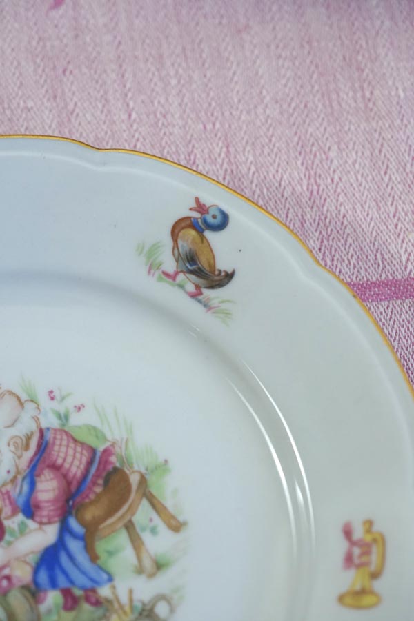 お皿の周りのあひる、蝶々、ラッパ、ジョウロなどの挿絵が素敵です。磁器です。