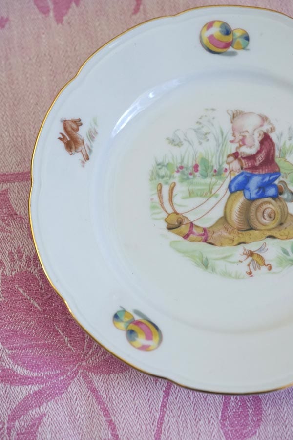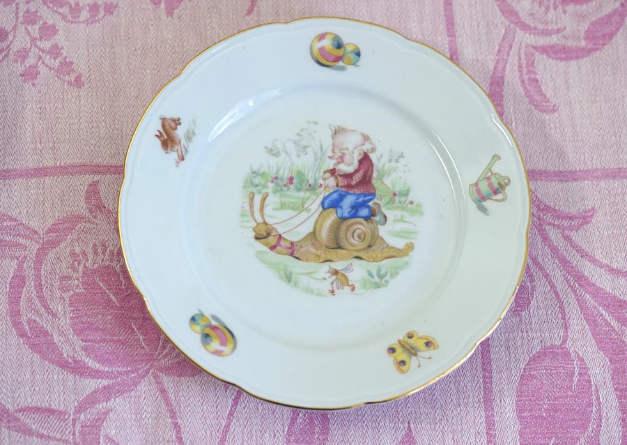 ポーランドの古都クラクフで出会いました。小人とカタツムリの挿絵が可愛いデザート皿です。小人のおじさんがカタツムリにのっています。お皿の周りのうさぎ、蝶々、ボール、ジョウロなどの挿絵が素敵です。磁器です。