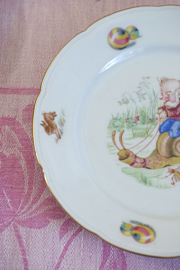 ポーランドの古都クラクフで出会いました。小人とカタツムリの挿絵が可愛いデザート皿です。小人のおじさんがカタツムリにのっています。お皿の周りのうさぎ、蝶々、ボール、ジョウロなどの挿絵が素敵です。磁器です。