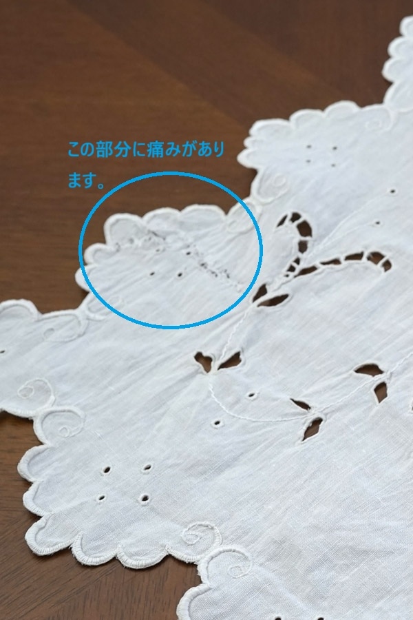 麻リネンにカットワークされています。愛用されて何度もお洗濯されて、生地の傷みの箇所もございます。