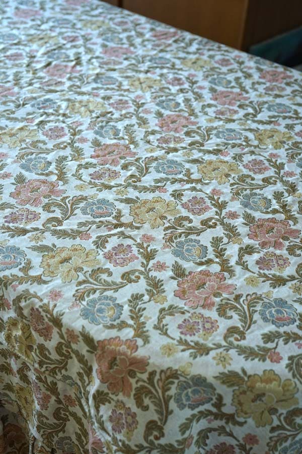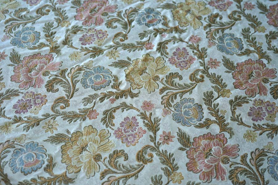 アイボリーの地色にコーラルやグレーシュな金茶やグリーン系が素敵なインテリアファブリックです。