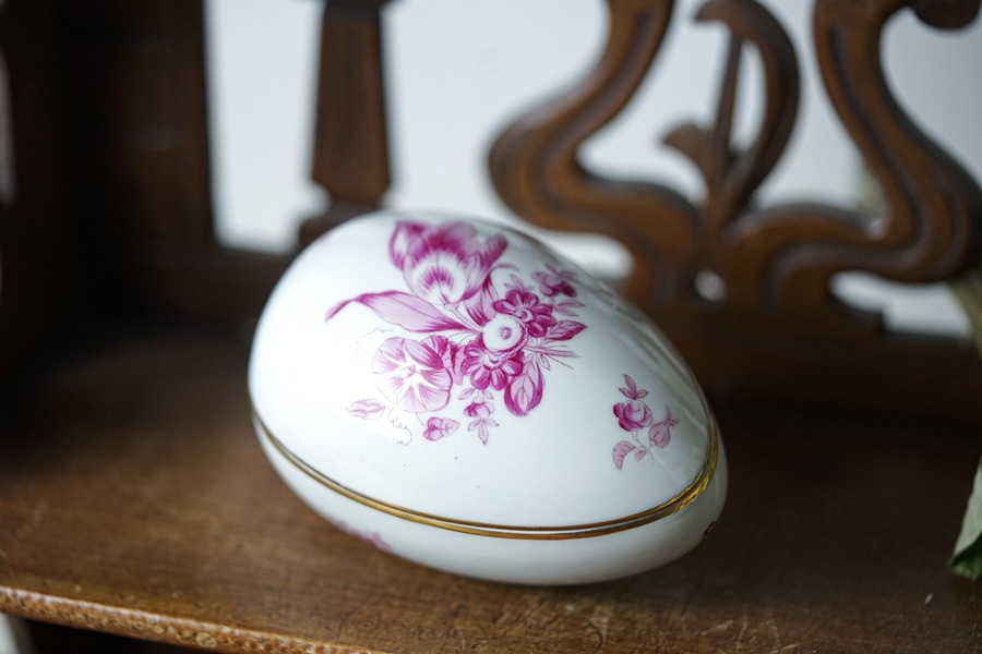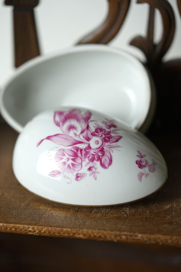 ヘレンドのたまご型の小物入れです。パープルピンクの手描きのブーケが美しいです。