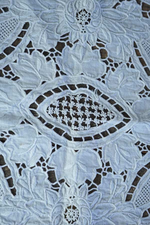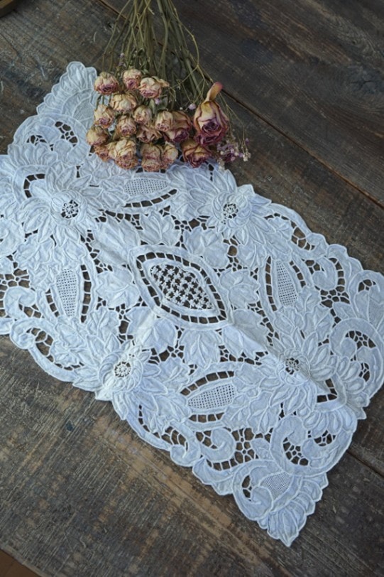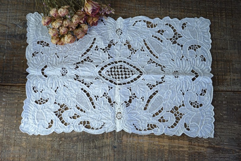 手の込んだカットワーク刺繍にニードルレースが入っていて見ているだけで飽きない素晴らしい手仕事のマットです。