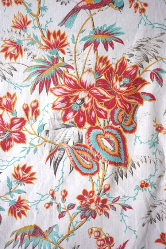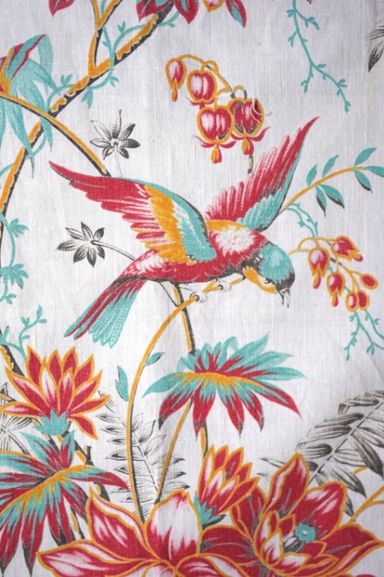 アンティークスクリーンプリントの鳥とお花のコットンファブリックです。