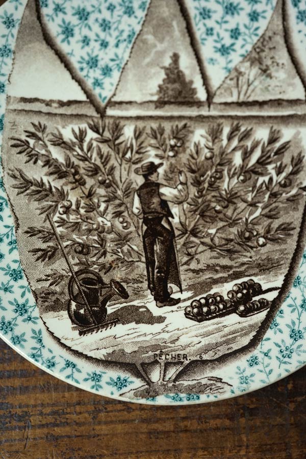 サルグミンヌ(Sarreguemines)製のオリーブの収穫が描かれたプレートです。