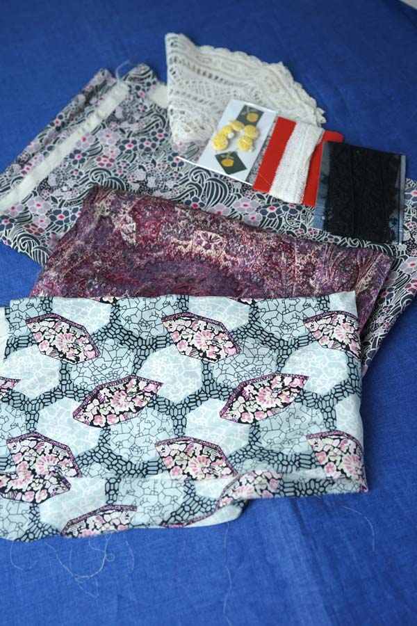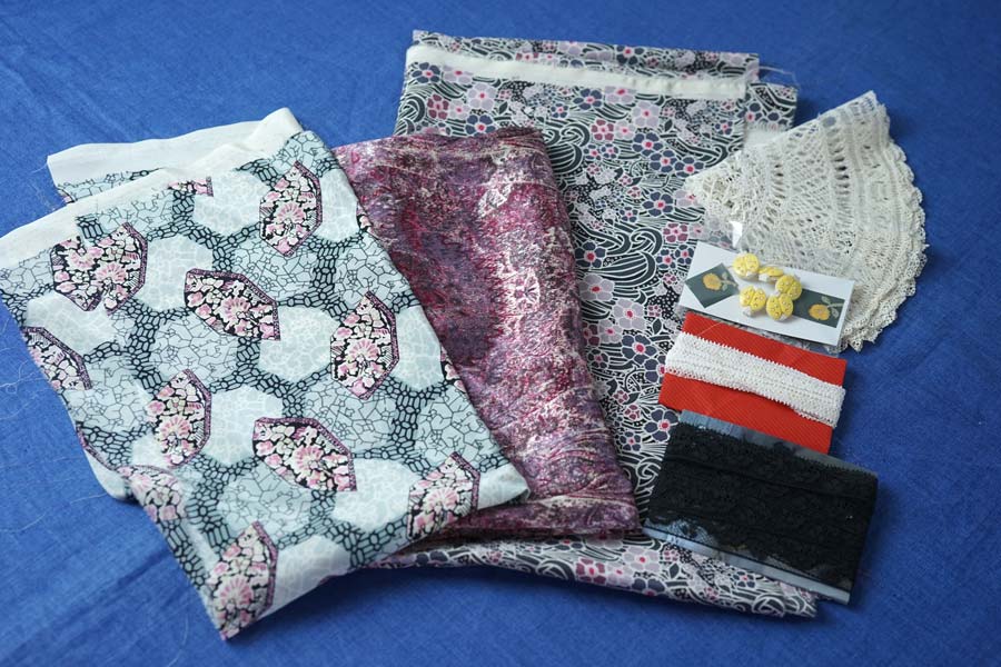 • リバティシルク左から33×55/31×100/45×140cm/ブラックレーストリム2m/ホワイトレース2m/テントウムシボタン5個