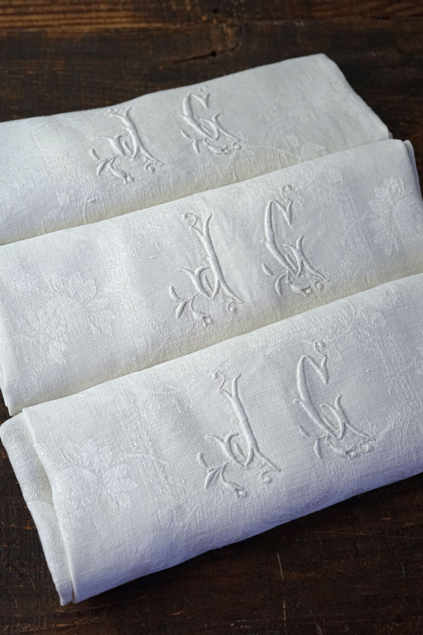 結婚のために準備されたフランスアンティークのダマスク織りリネンにJCのボリュームのあるサテンステッチのアルファベット刺繍のナプキンです。