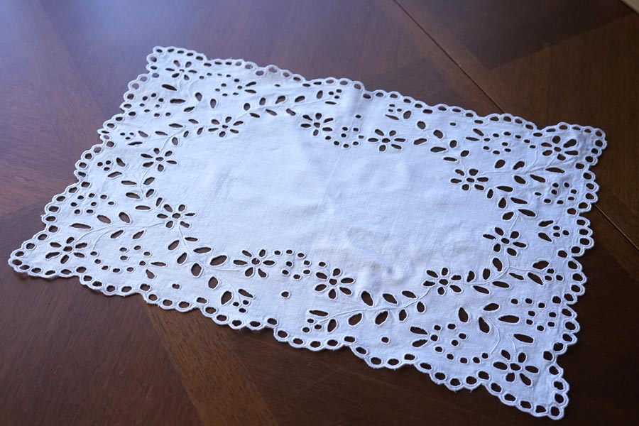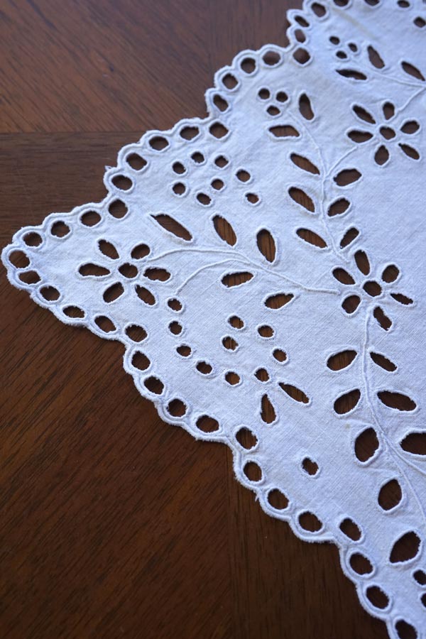 輸入アンティーク通販TOP >アンティーク刺繍 > ホワイトワーク、カットワークの刺繍 > リネンにアイレット刺繍のテーブルマット47×31cm ge-1103