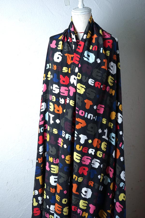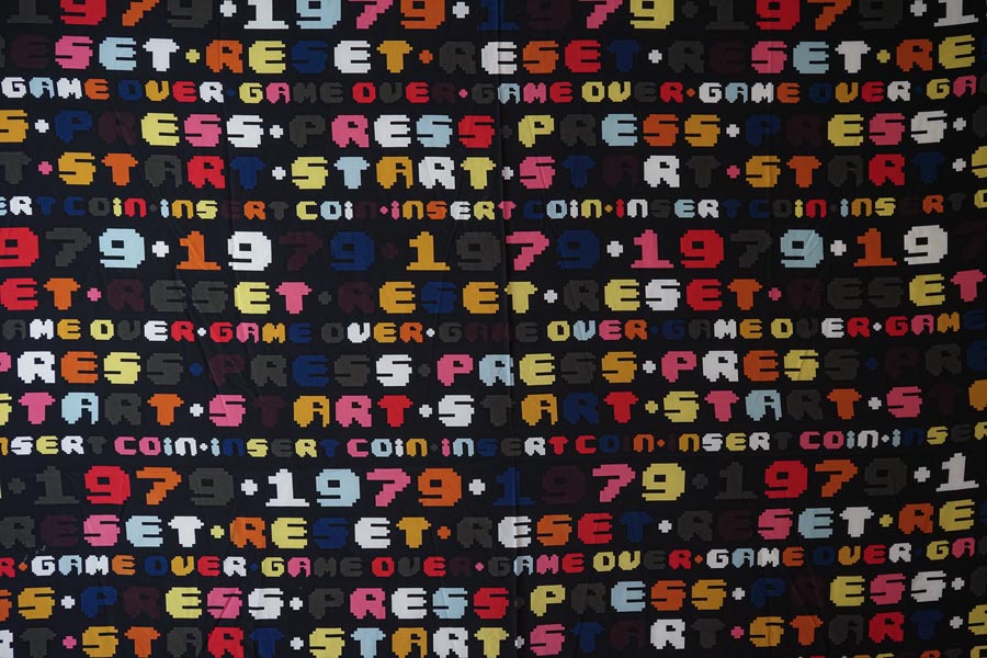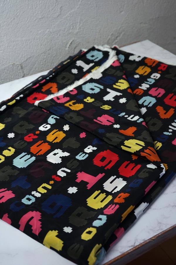 この生地は、1979、Reset、Game Over、Press Startといった文字のデザインが素敵です。これらの数字やアルファベットは、非常に洗練されたデザインで、見る人の目を惹きつけます。素材は上質なシルクを使用しており、グログラン織ならではのしっかりした打ち込みのファブリックです。