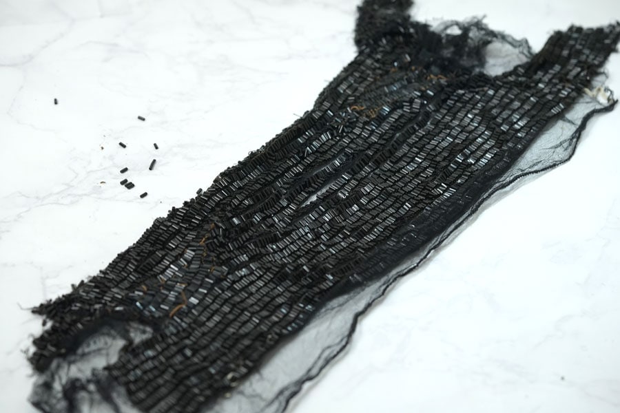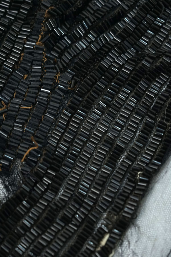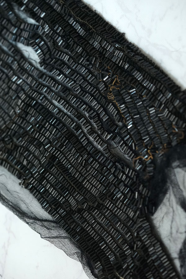 イギリスのアンティークフェアで出会った4mmのブラックのガラス竹ビーズがびっしり縫い付けられたドレスパーツです。