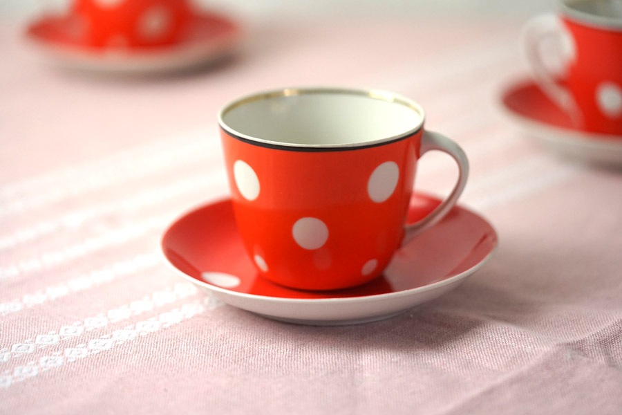 ラトビアのリガで生まれた、温かみのあるシナバー色のドットが印象的なカップ&ソーサーです。