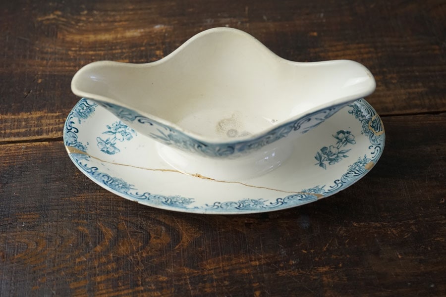 フランスからの輸送中に割れたお皿部分とチップを金継ぎで修復