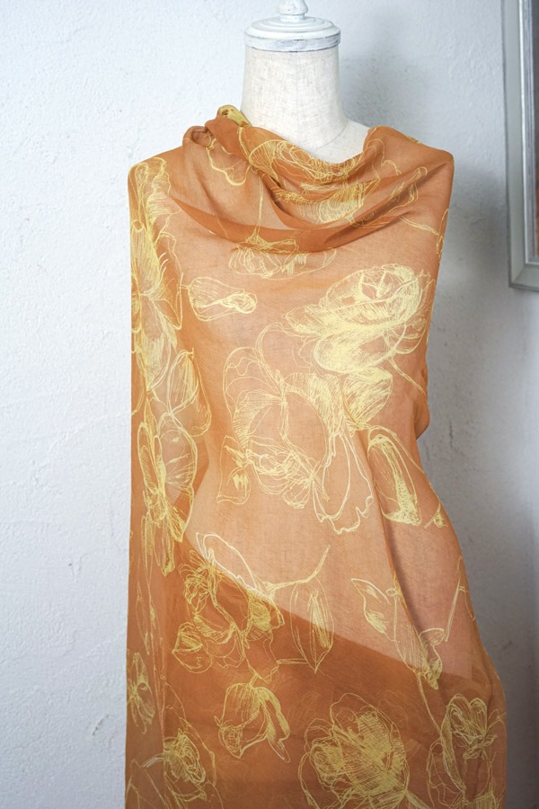 • 優雅な透け感と色使い: 繊細な透け感を持つシルクシフォンに、オレンジがかったシックなブラウンをベースとし、鮮やかなイエローの線描きで大胆なフローラルモチーフが描かれた、大変優美なファブリックです。