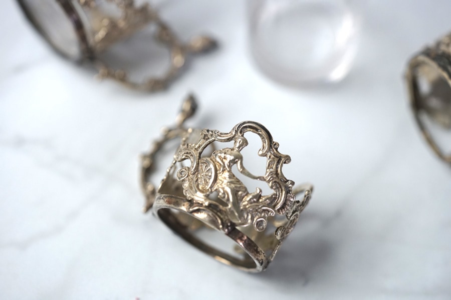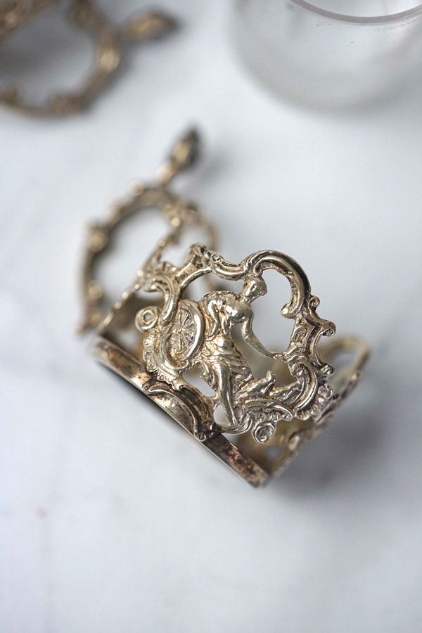 クリアなグラスを包み込むように施されたシルバーのカバーは、息をのむほどに美しく繊細な細工が特徴です。