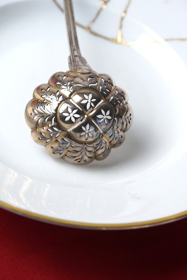 フランスから届いた、ピアス加工(透かし彫り)が美しい大型のシフタースプーンです。