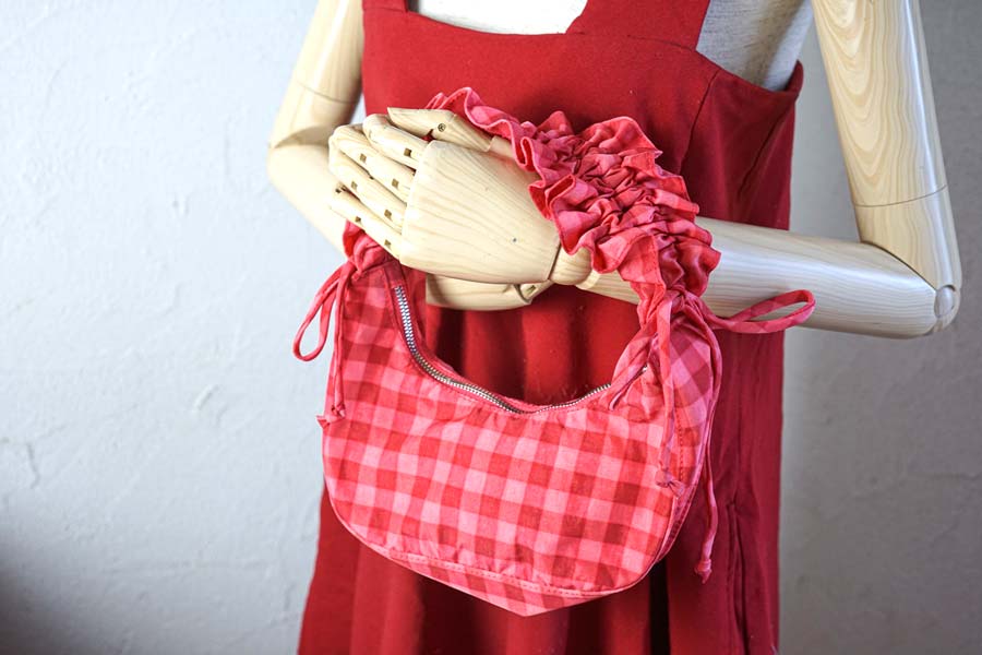 ロンドンのデザイナー、モリー・ゴダードらしい贅沢なフリル使いと、BAGGUが得意とする軽やかなリサイクルナイロン素材。その意外性のある組み合わせと、お顔周りを明るくしてくれるルビーレッドのチェックが、大人の遊び心をくすぐるガーリッシュなデザインです。