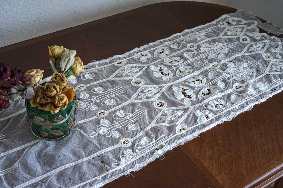 アンティークチュールにコーネリー刺繍のクロス