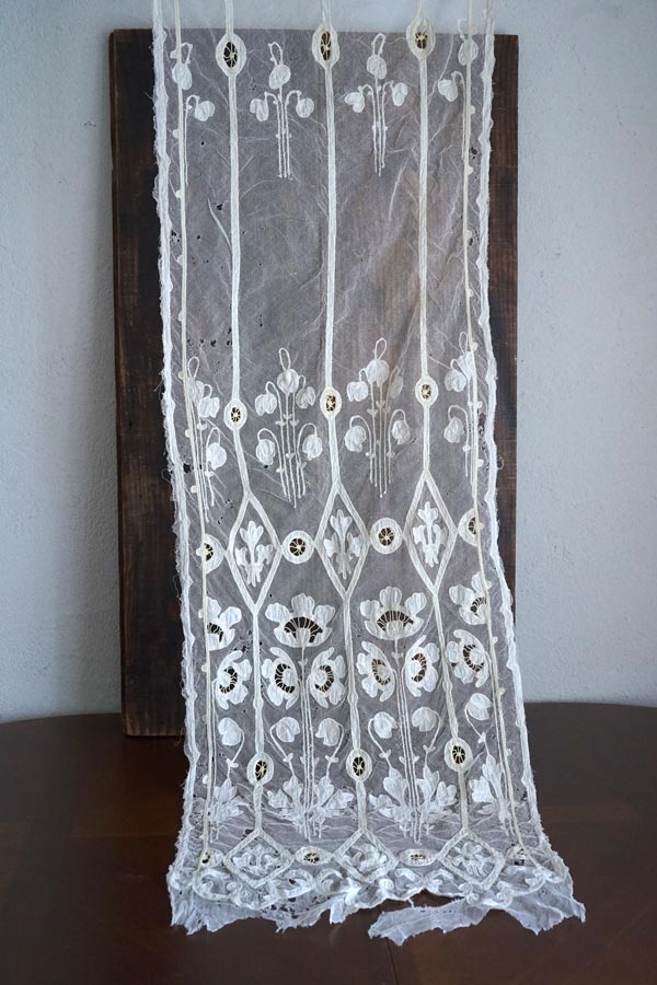 チュールの痛みはかなりありますがアプリカシオンが美しいので裏にオーガンジーなどを裏地にすると実用的でテーブルランナーとしてもお使いになれます。