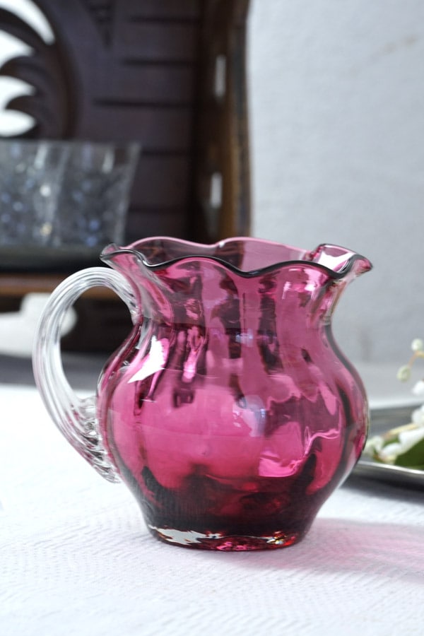 神秘的な光を放つ美しいクランベリーガラスのジャムポットです。