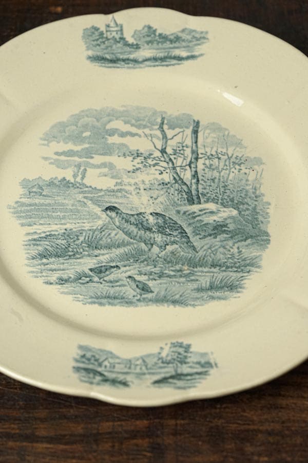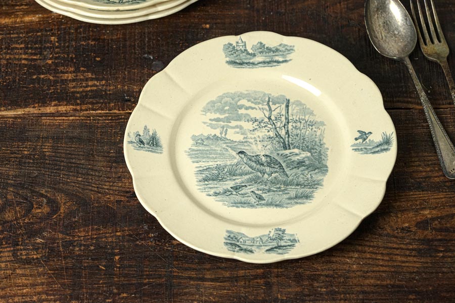 花リムで鶉の親鳥と雛ののどかなカンパーニュ柄のプレートです。