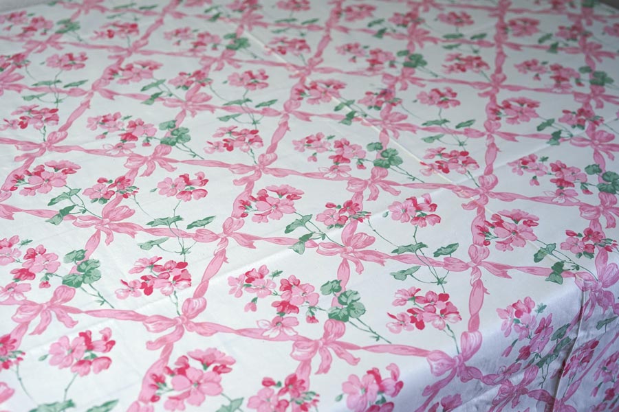 ピンクのリボンの格子にピンクのお花が可愛いファブリックです。