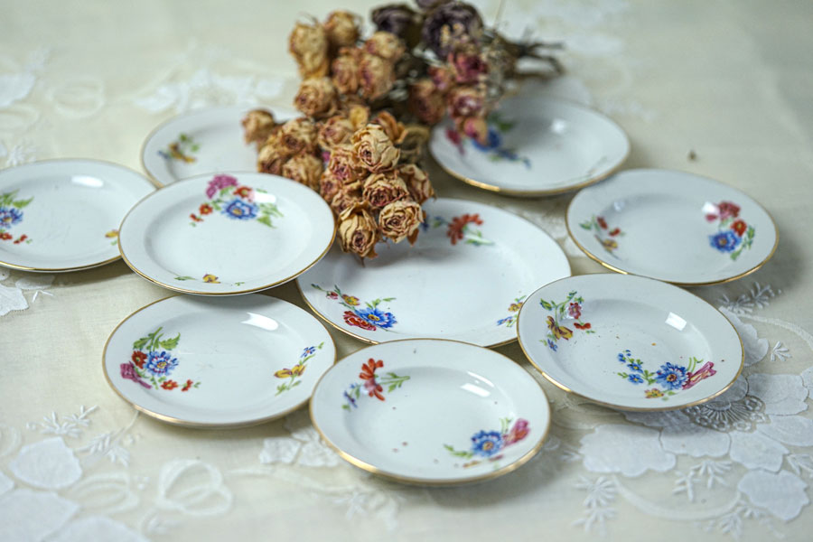 輸入アンティーク通販TOP >おままごとセット・ディネット・ミニチュア家具 > フランスハンドペイントお花のディネット・プレート9点セット gc-1683