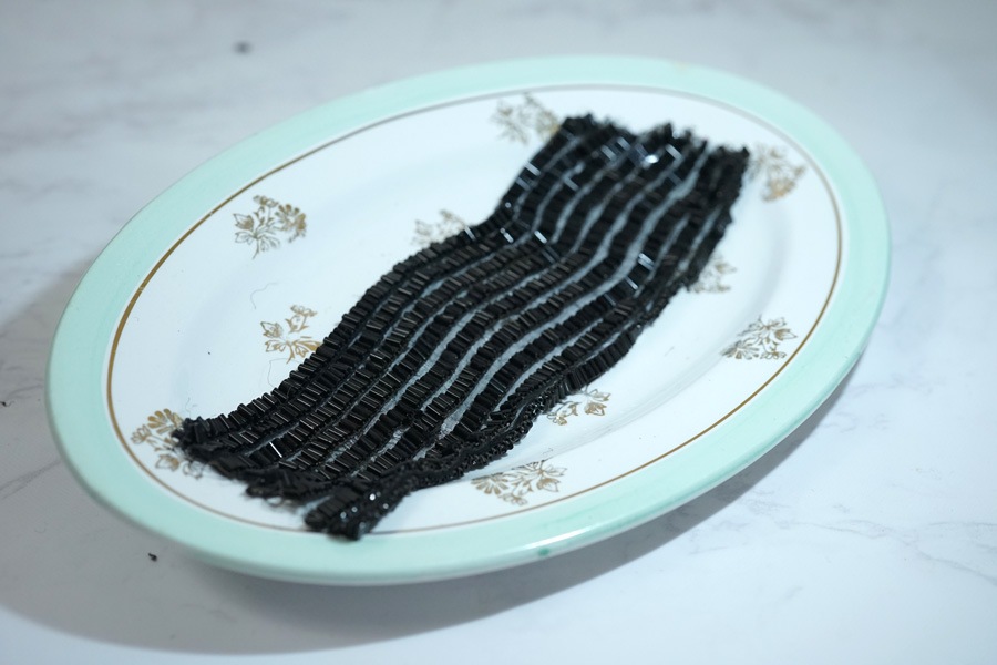 イギリスのアンティークフェアで出会った4mmのブラックのガラス竹ビーズがびっしり縫い付けられたドレスパーツです。