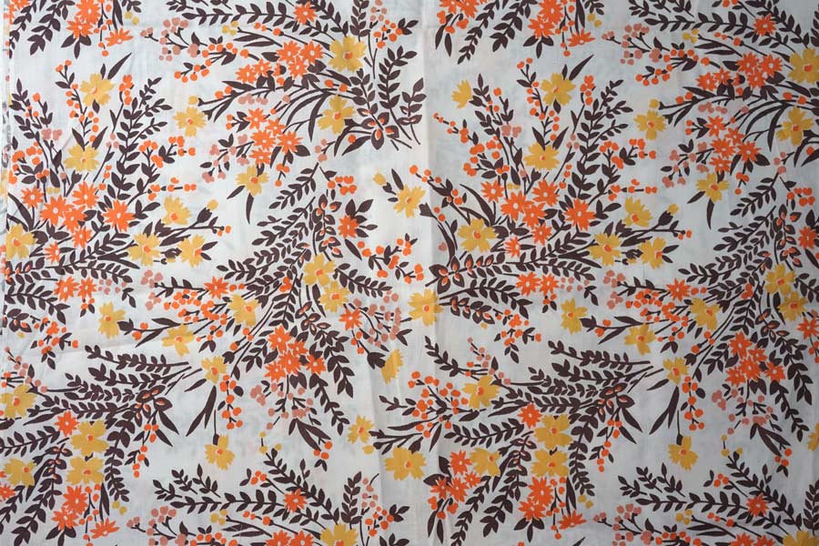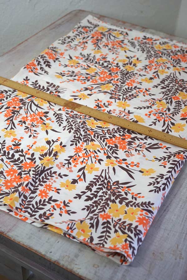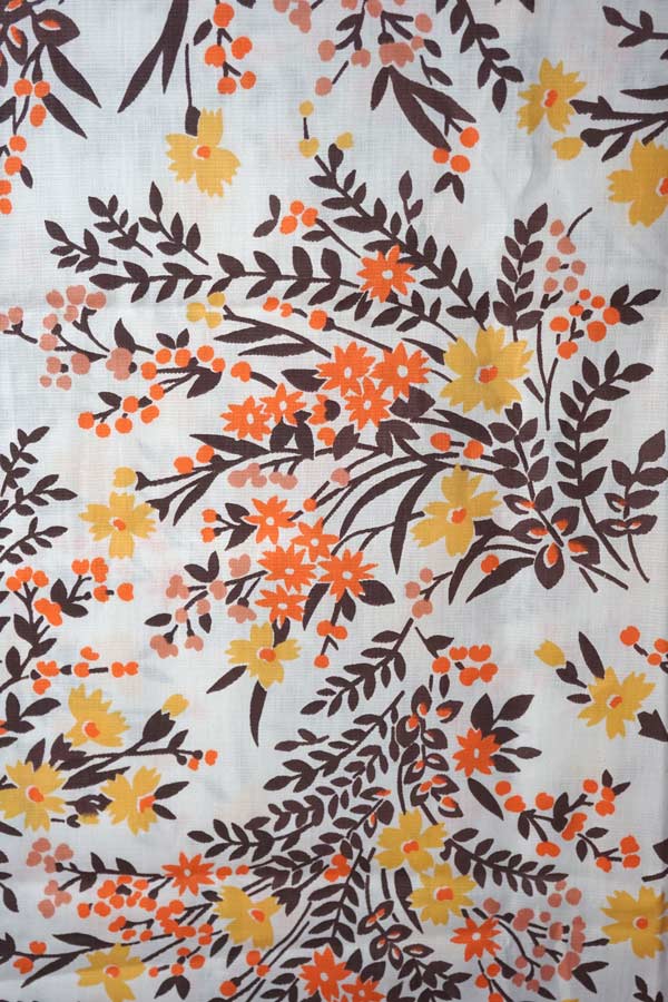 エストニアで出会ったお花柄のコットンファブリックです。涼し気な畝のあるコットンです。ブラウン、オレンジ、イエローのコンビネーションが素敵です。インテリアやお洋服にも向いています。1単位のサイズ:W80×48cm。全量で4単位、2mございます。1960-80年代頃。