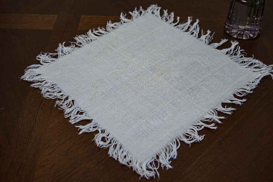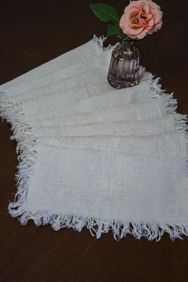 フランスダマスク織のスクエアリネンです。周囲はリネンを解いた房がふさふさとしていて豊かな気持ちになります。