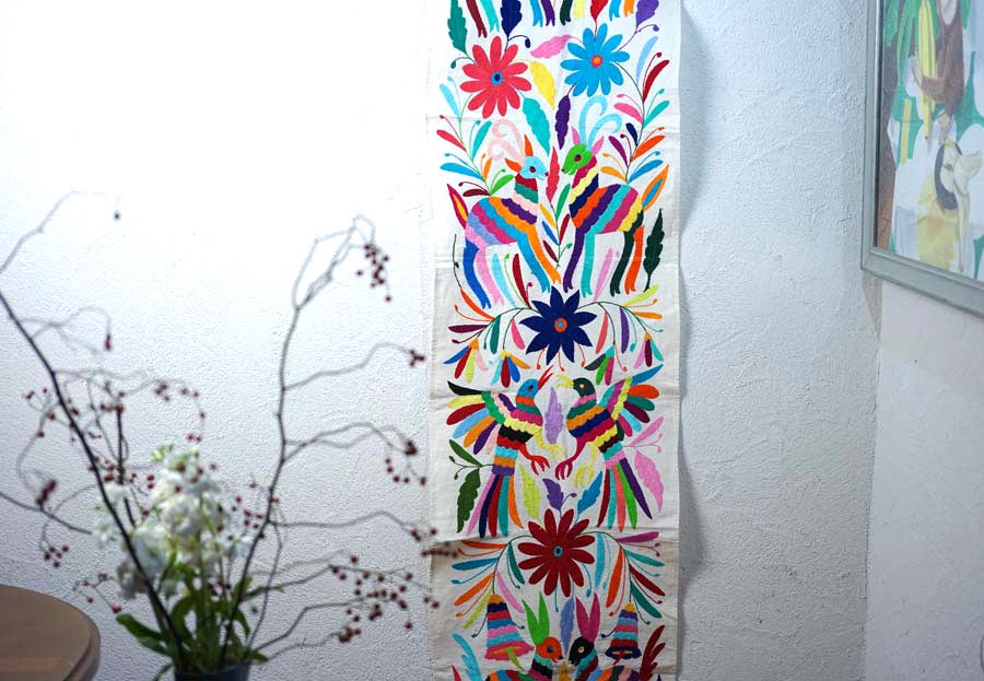 • パステル調の絵の具で描いたかのような美しい色合いが美しいです。このようにタペストリーとしても楽しめます。掛け軸のようなイメージ使っていただくこともできます。 ハイブランドのエルメスがスカーフの図案に取り入れて一躍世界的に有名になったオトミ族の刺繍です。