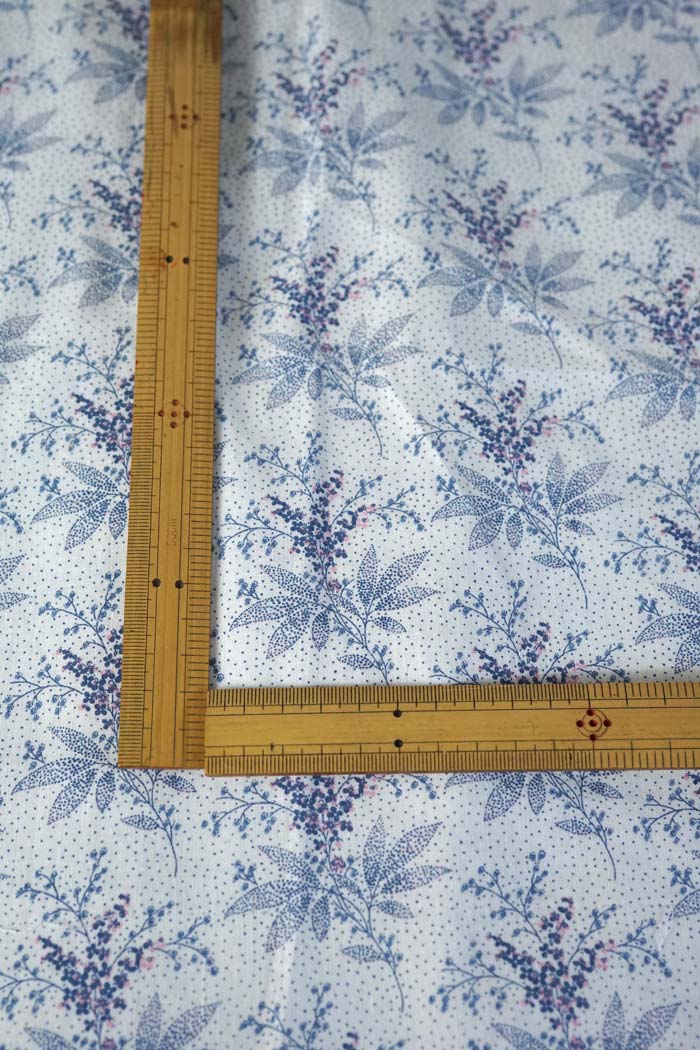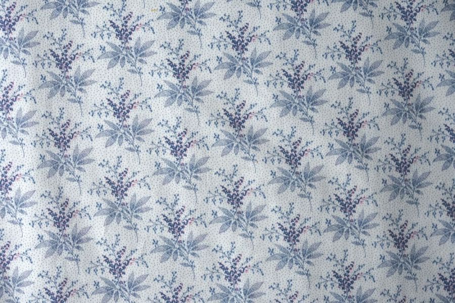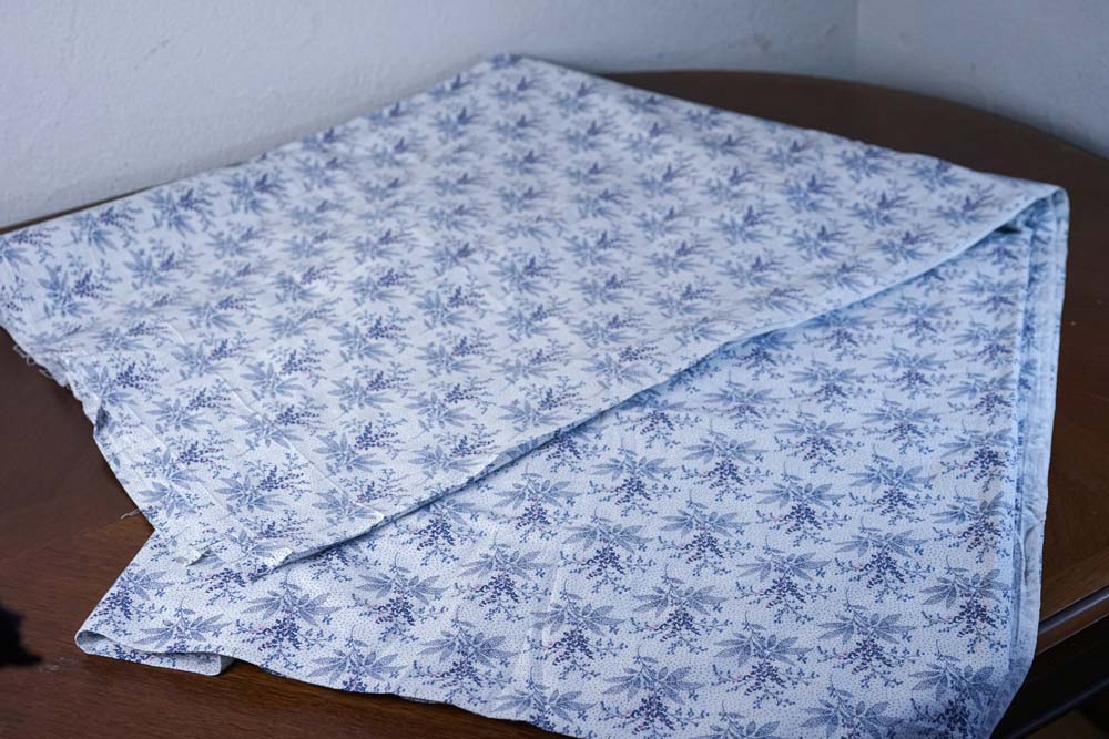 白地にグレーッシュなブルーのボタニカルモチーフが愛らしく並んだ、爽やかなフランスヴィンテージのコットン生地です。