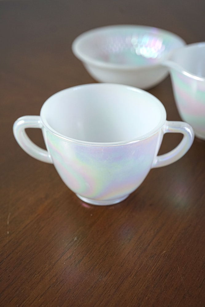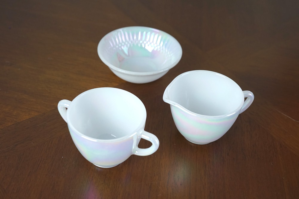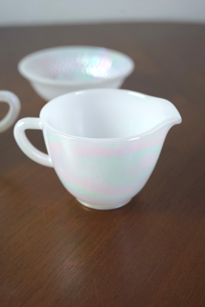 ぽってりとした温かみのあるミルクガラスに、真珠のような艷やかなオーロラ加工(イリデッセンス)が施された、フェデラル社(Federal Glass)のヴィンテージ3点セットです。