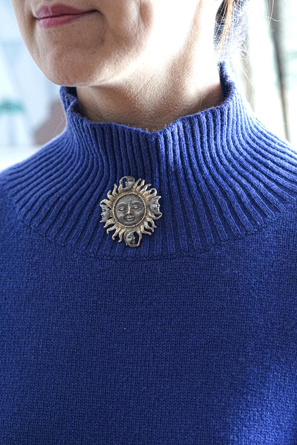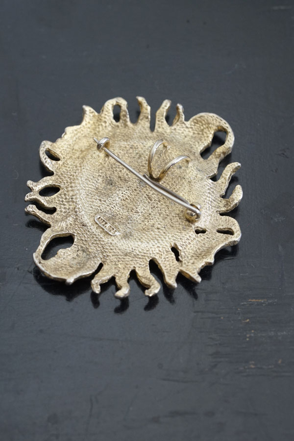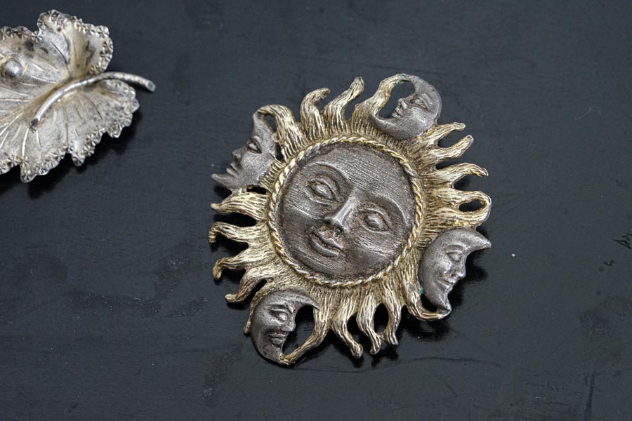 スターリングシルバーにゴールドプレートを施した太陽のコロナが輝くブローチです。