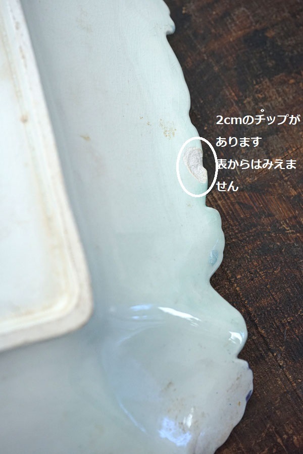 アーティチョークとアスパラは同じ季節に採れるようでアスパラとセットで登場することが多いです。裏側の縁に2cmと1cm程のチップと1か所アーティチョークのパープルのお花の端にチップがあります。ほぼ目だたない個所です。