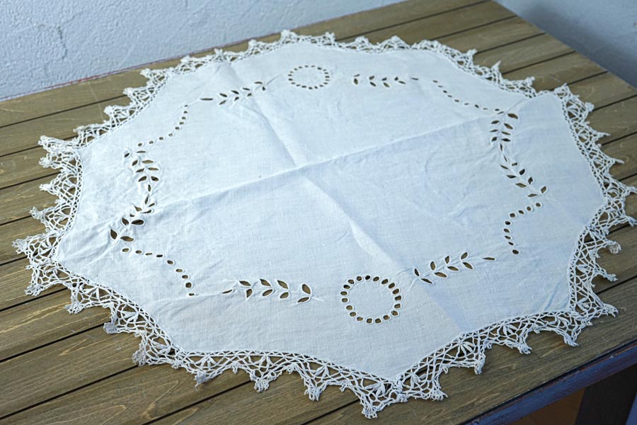 輸入アンティーク通販TOP >アンティーク刺繍 > ホワイトワーク、カットワークの刺繍 > リネンにカットワーク刺繍とボビンレースの縁取りのテーブルマットW70cm ge-978
