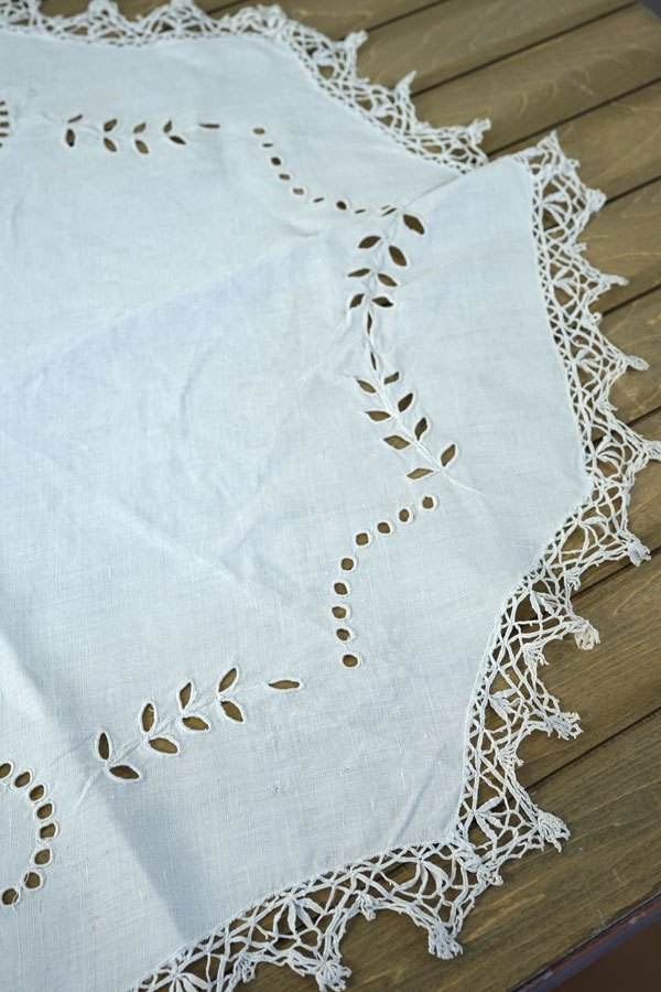 リネンにカットワーク刺繍とボビンレースの縁取りのテーブルマットです。