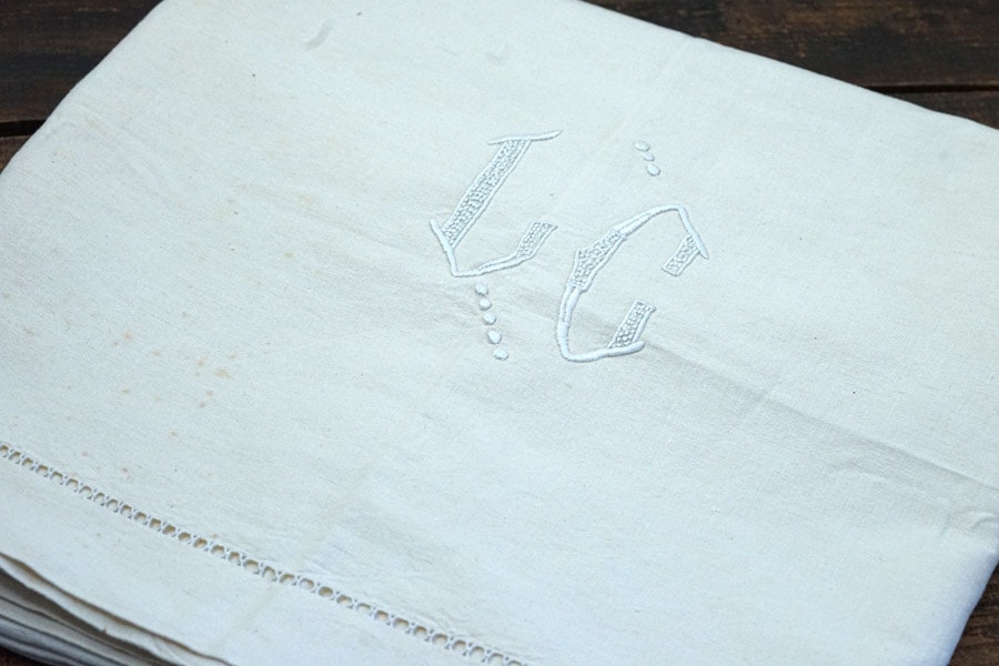 アンティークフレンチリネンシーツLCアルファベットモノグラム入りです。