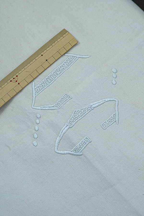 W205×L280cm 刺繍のモノグラムの部分は12×15cm。2m幅で1cm幅のドロンワーク刺繍