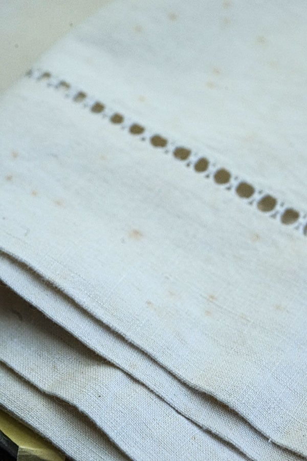100年ほど前のアンティークリネンですので保管によるシミなどがありましたので、クリーニングにだしました。