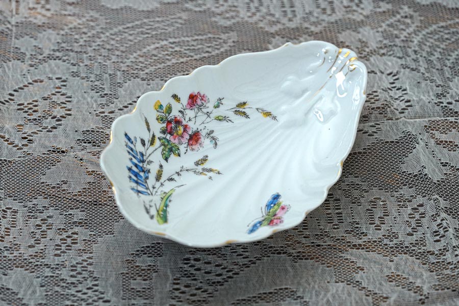 輸入アンティーク通販TOP >アンティーク食器・陶磁器・テーブルウエア > フランスの食器・陶磁器&テーブルウエア > アンティークシェル型にお花と蝶々のハンドペイントのラヴィエ gc-1553
