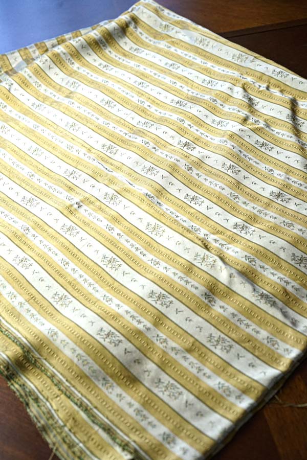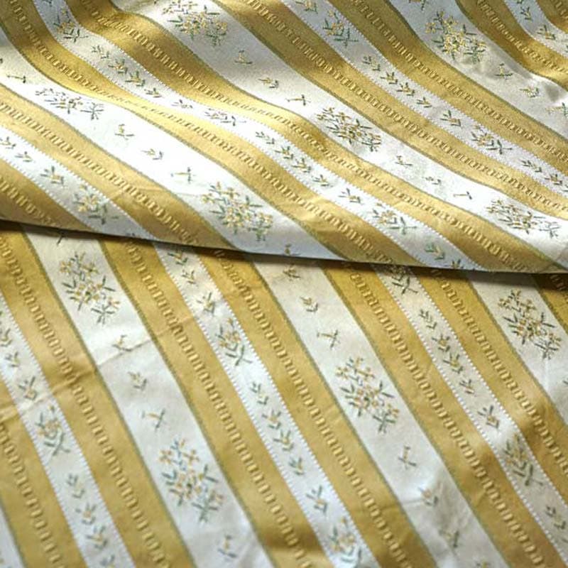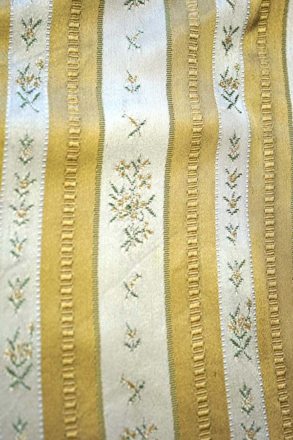 マスタードとアイボリーのストライブにお花が織りだされていて光沢のある美しいファブリックです。しっかりと織り込まれたファブリックです。 レーヨンで、シルクのような光沢です。