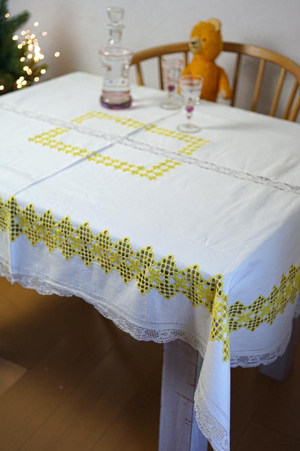今回ハンガリーで買い付けたリネンにレモンイエローのカットワーク刺繍とボビンレースのテーブルクロス156×107cmです。