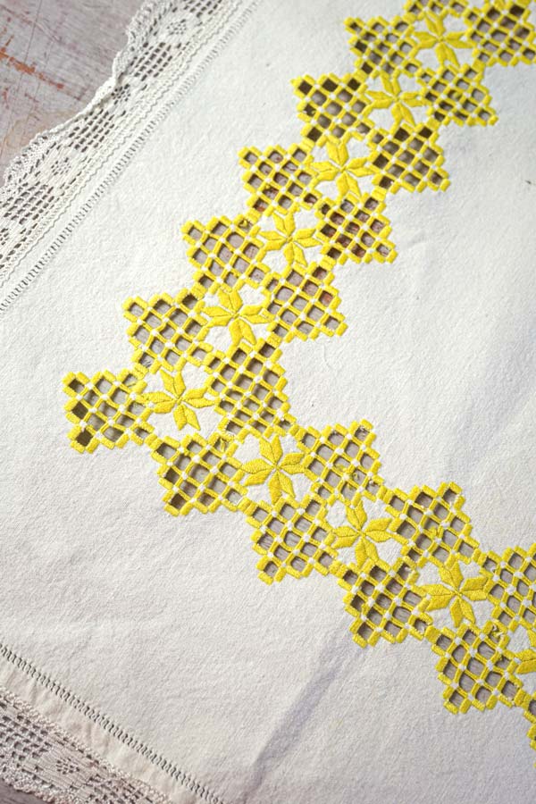 イエローのカットワーク刺繍が瑞々しい素敵なクロスです。