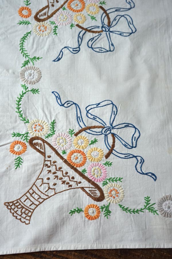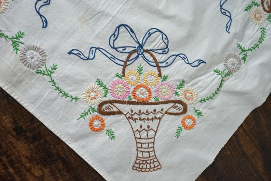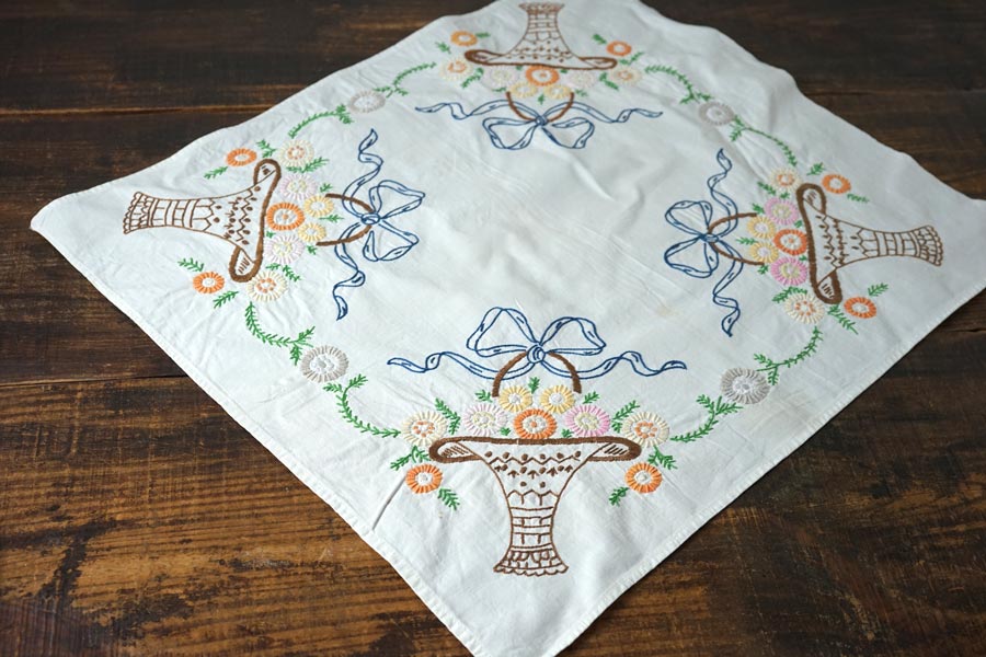 布の4カ所に同じモチーフのフラワーバスケットが可愛いクロスです。