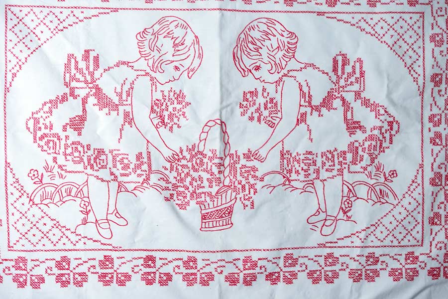 クロスステッチやアウトラインステッチで2人の少女が花籠のお手入れをしている可愛いタペストリーです。