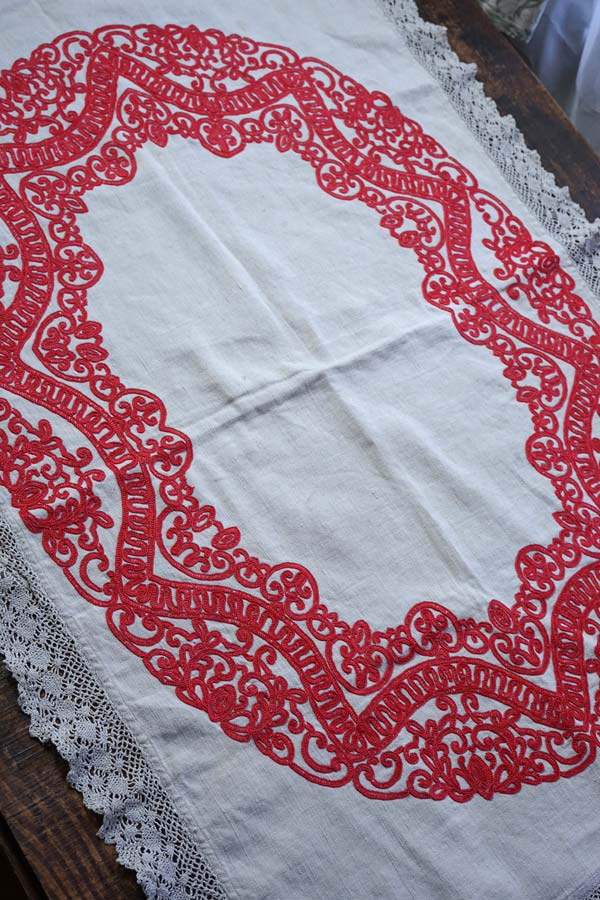縁には素朴で力強いハンドメイドのレースが周囲を飾っています。