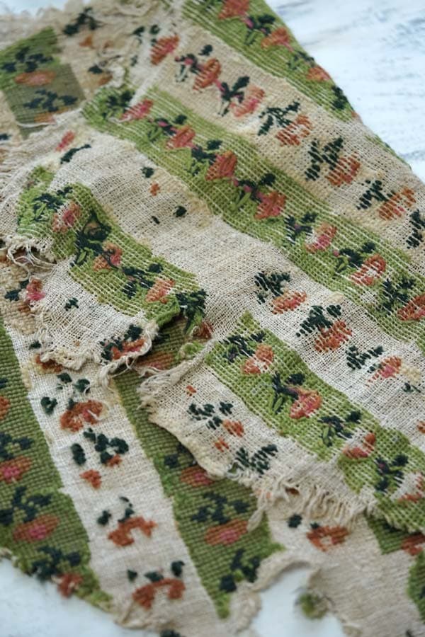 • 裏側です。麻の台布の質感と毛糸のニードルポイントの朽ち加減が素敵です。