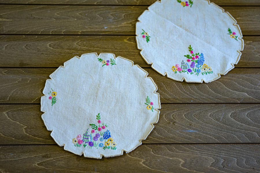 イングリッシュガーデンで遊ぶ女の子の刺繍とアップリケのクリーム色のマット3点セットです。お花や女の子、縁の刺繍も全て手刺繍で美しいです。リネン。サイズ:オーバルマット41.5×29cm/円形マットW17cm。1940-50年代頃。