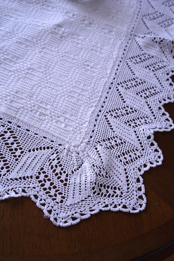 こちらは伝統的な手織りにリネン45×140cm2枚を薔薇のクロッシュレースと幾何学モチーフのクロッシュレースで囲まれています。