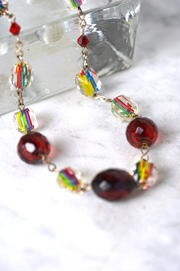 イギリスのレインボーガラスとザクロ色のガラスのネックレス42cm 1930年代 ga-1112